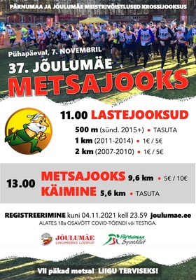 Eelregistreerimine kestab kuni 04.11.2021 kell 23:59 juhendis toodud lingil Jõulumäe kodulehel: https://joulumae.ee/events/joulumae-metsajooks-2021/?occurrence=2021-11-07